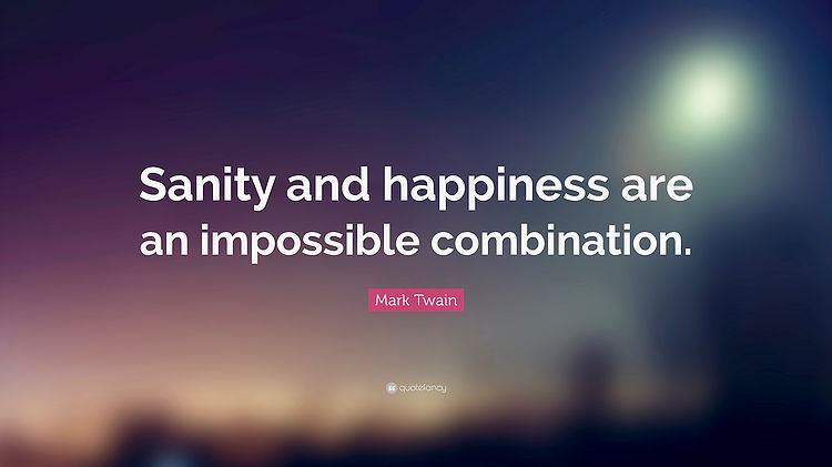 Sanity and Happiness are an Impossible Combination – Mark Twain Posted on November 13, 2018 by meltingneurons Your shares are appreciated, thank you. Share on Reddit (Opens in new window) Reddit TweetShare on Tumblr Email a link to a friend (Opens in new window) Email Print (Opens in new window) Print MorePocket Share on Telegram (Opens in new window) Telegram Share on WhatsApp (Opens in new window) WhatsApp Like Loading...